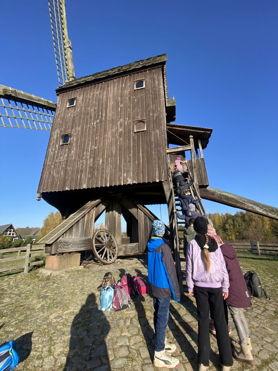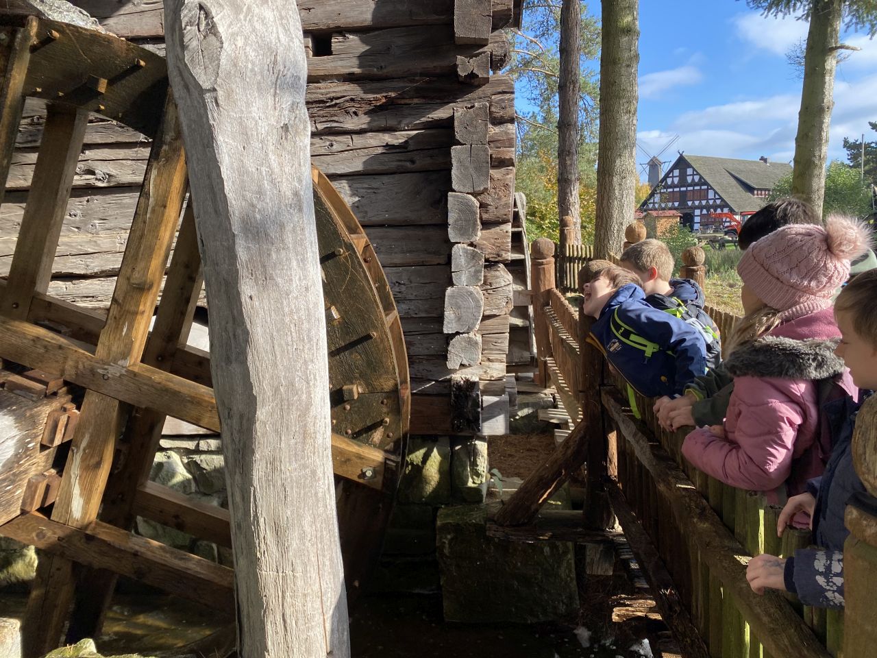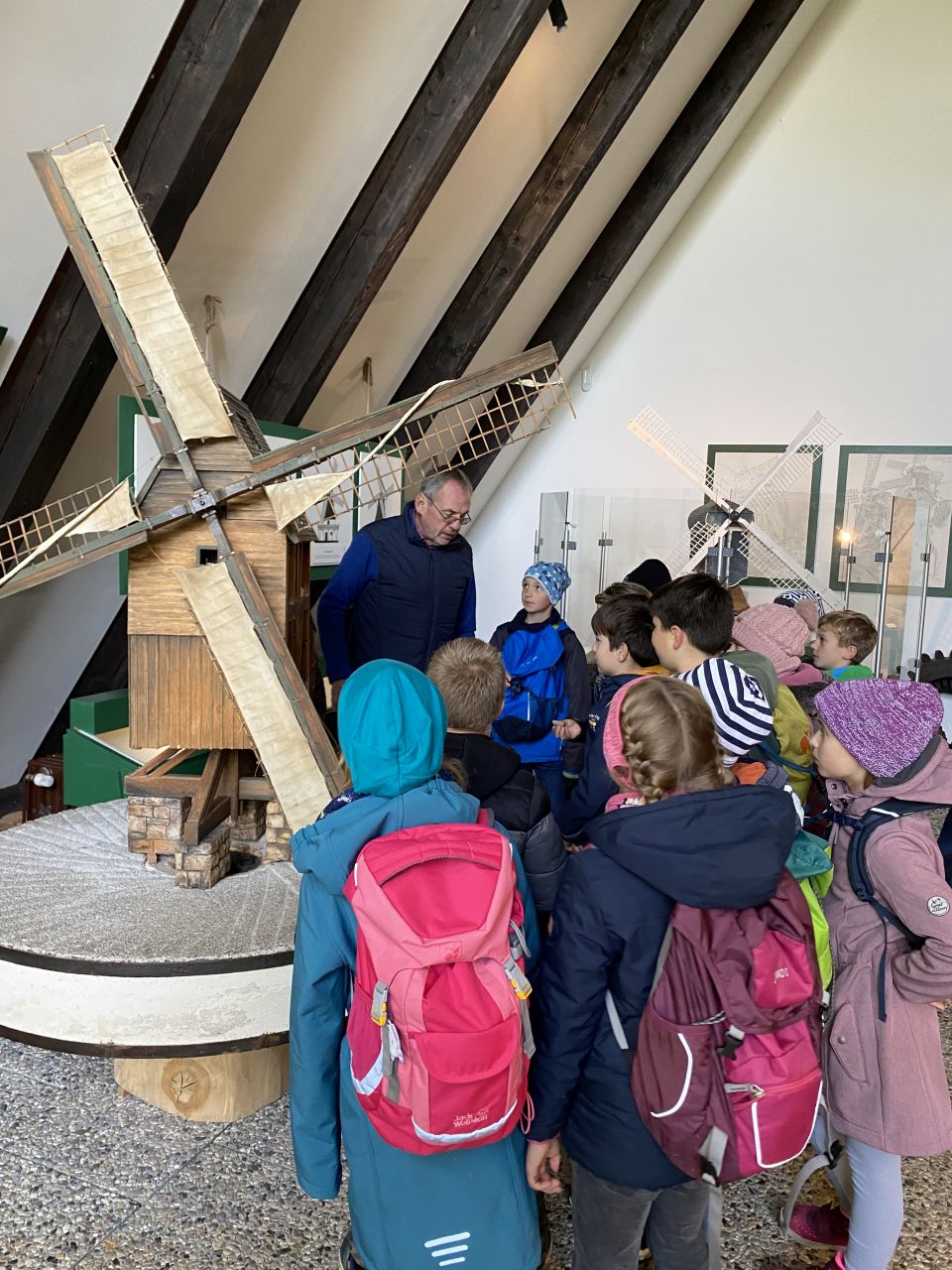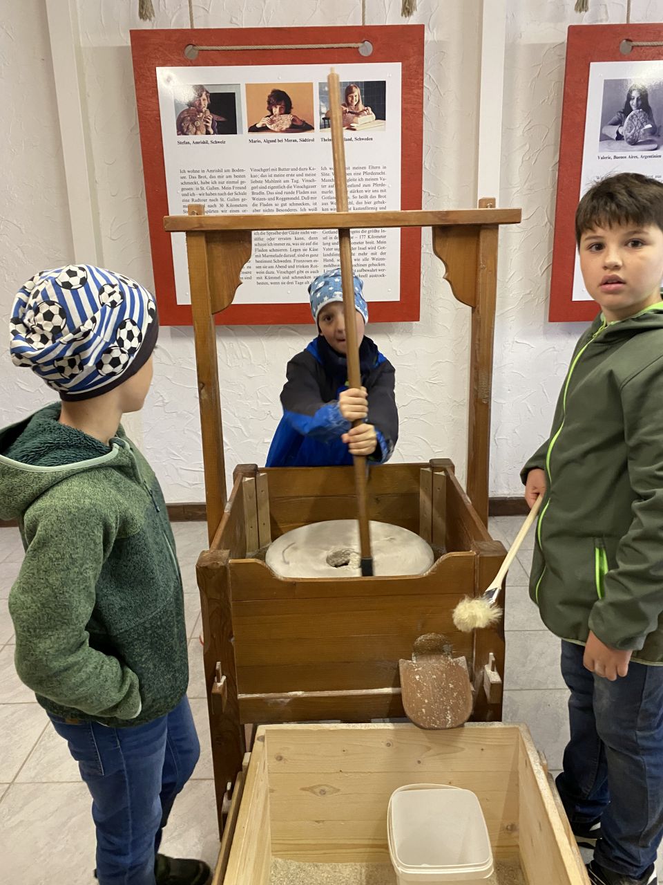 Die 3. Klassen besuchten bei strahlend blauem Himmel das Mühlenmuseum. Hier sahen sie die verschiedenen Mühlen und im Ausstellungsgebäude konnten sie selbst Mehl herstellen.