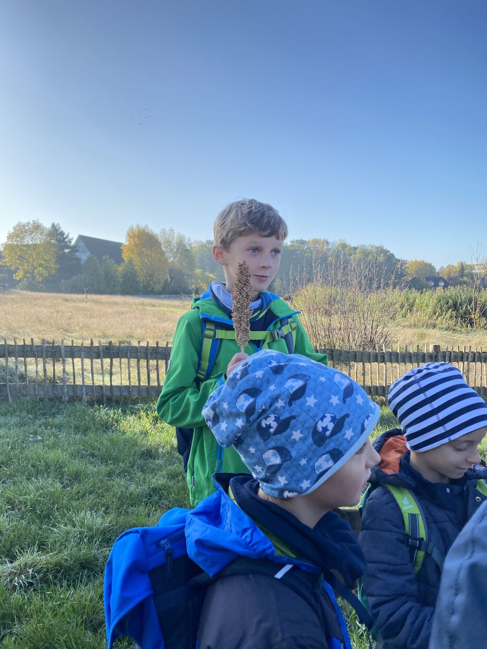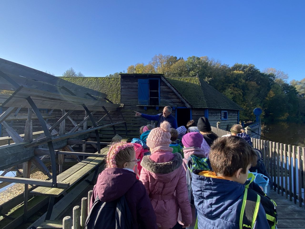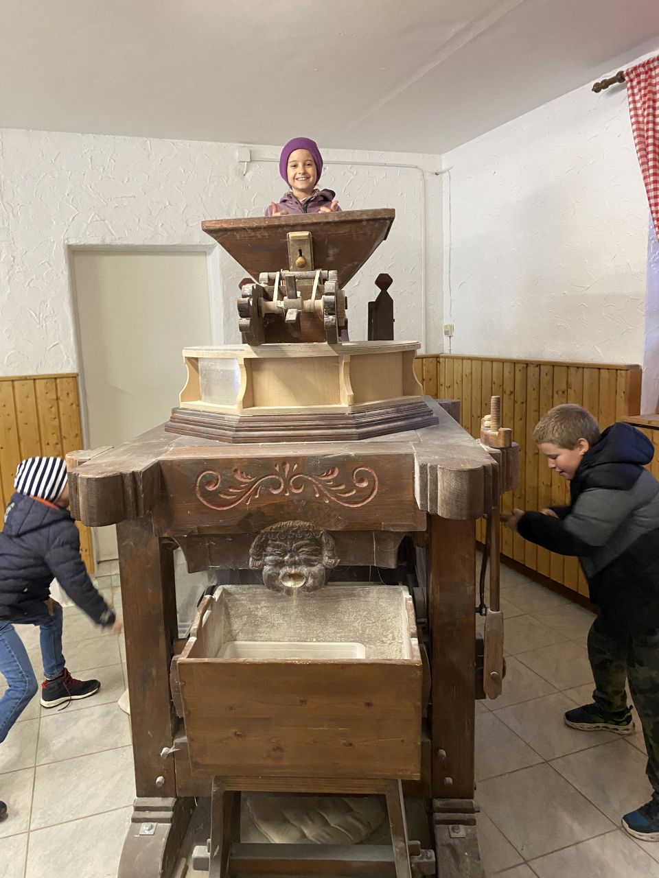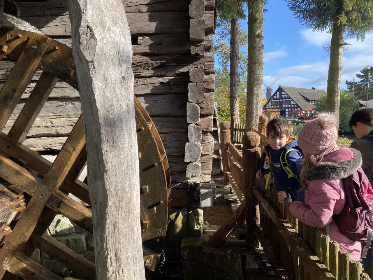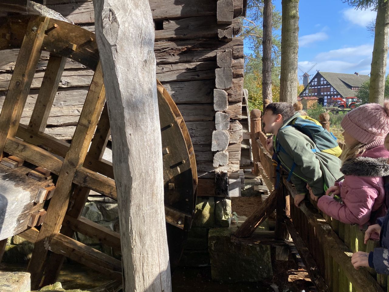 Die 3. Klassen besuchten bei strahlend blauem Himmel das Mühlenmuseum. Hier sahen sie die verschiedenen Mühlen und im Ausstellungsgebäude konnten sie selbst Mehl herstellen.