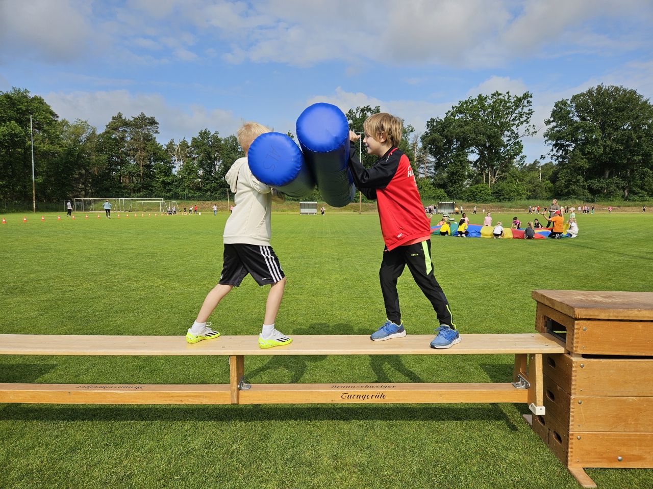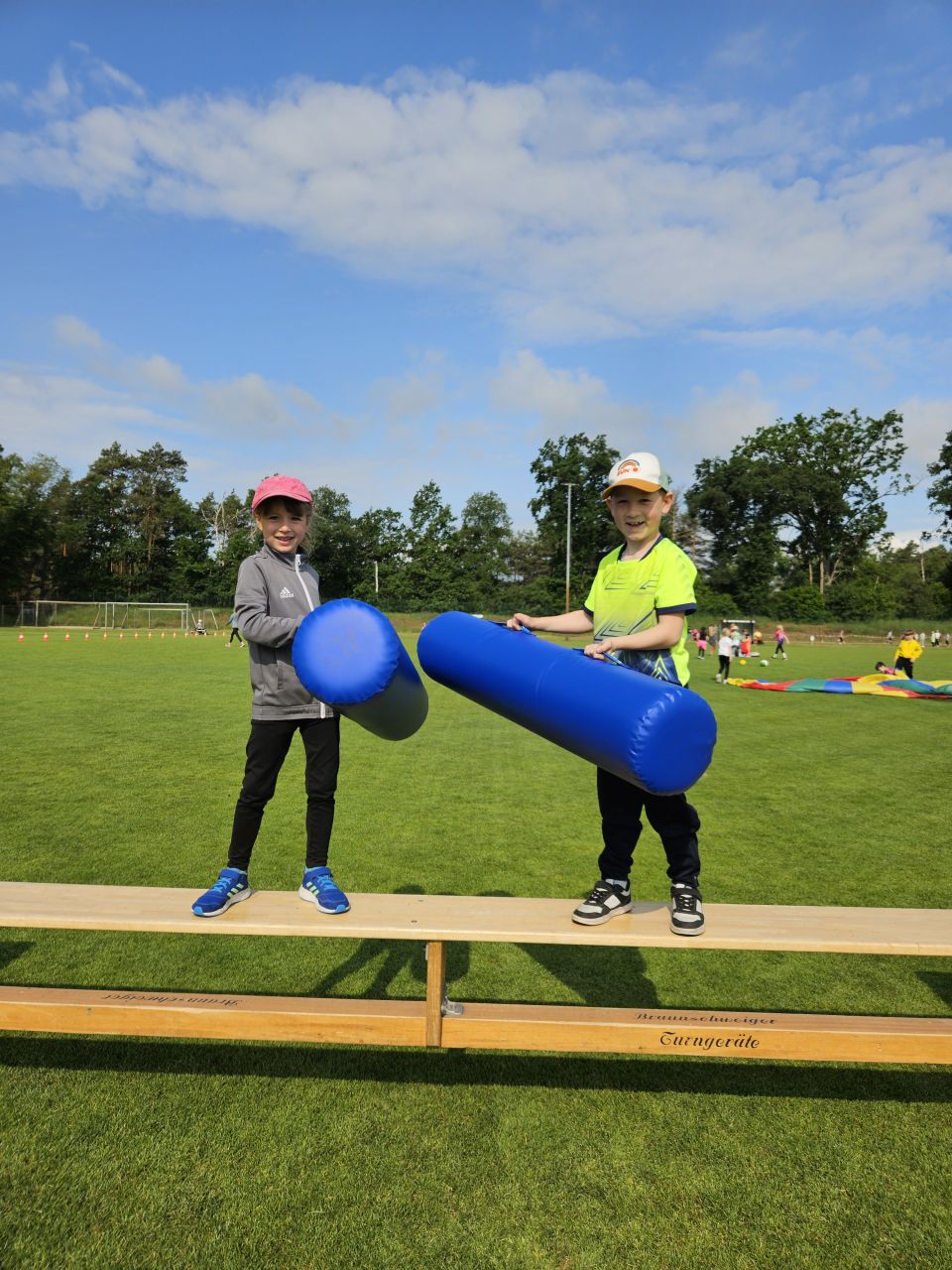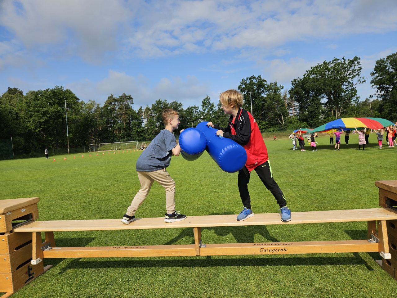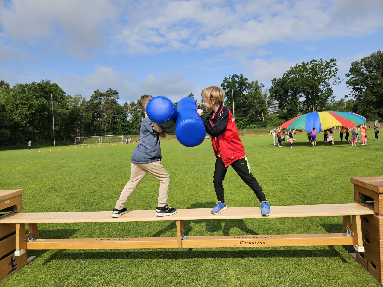 Auch beim diesjährigen Bundesjugendspiele-Wettbewerb hatten wir viel Glück mit dem Wetter. Der angesagte bewölkte Himmel wechselte in ein strahlendes Blau und viel Sonnenschein. Alle Teilnehmer, ob groß oder klein, hatten viel Spaß und nahmen den Wettbewerb sehr ernst. Die Kinder bewiesen sich in den Disziplinen: Ausdauerlauf, Weitwurf, Weitsprung und Kurzstreckenlauf. Drumherum waren viele Spielestationen aufgebaut. Vielen Dank an die zahlreichen Helfer.